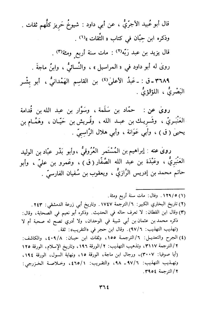 (4) الجرح والتعديل: 6 / الترجمة 155، وثقات ابن حبان: 8 / 409، والكاشف: 2 / الترجمة 3117، وتذهيب التهذيب: 2 / الورقة 196، وتاريخ الاسلام، الورقة 125 (أيا صوفيا: 3007) ، ورجال ابن ماجة، الورقة 15، ونهاية السول، الورقة 194، وتهذيب التهذيب: 6 / 97 - 98، والتقريب: 1 / 465، وخلاصة الخزرجي: 2 / الترجمة 3954.