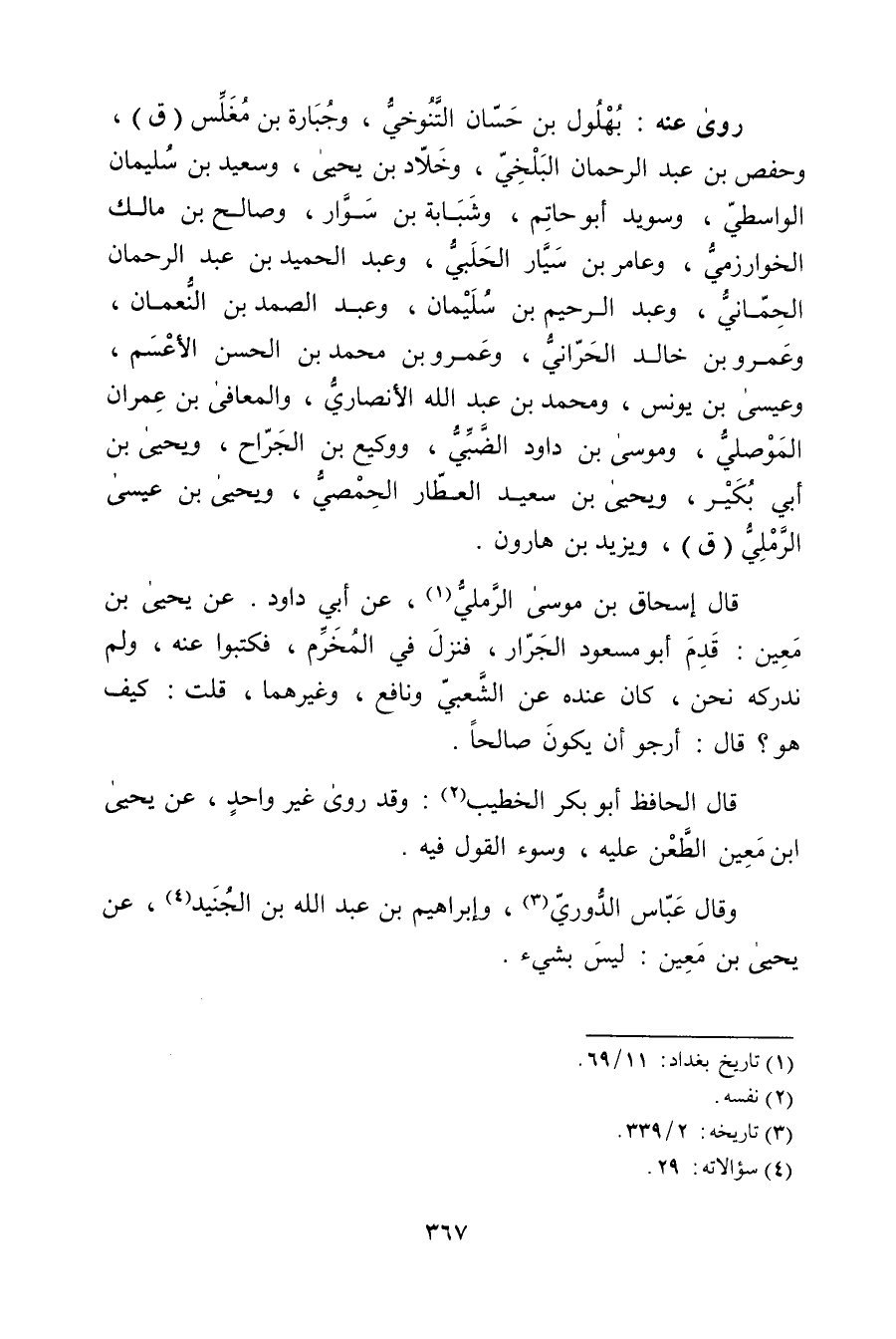 قال الحافظ أَبُو بكر الخطيب (2) : وقد روى غير واحد، عَنْ يَحْيَى ابن مَعِين الطعن عليه، وسوء القول فِيهِ.