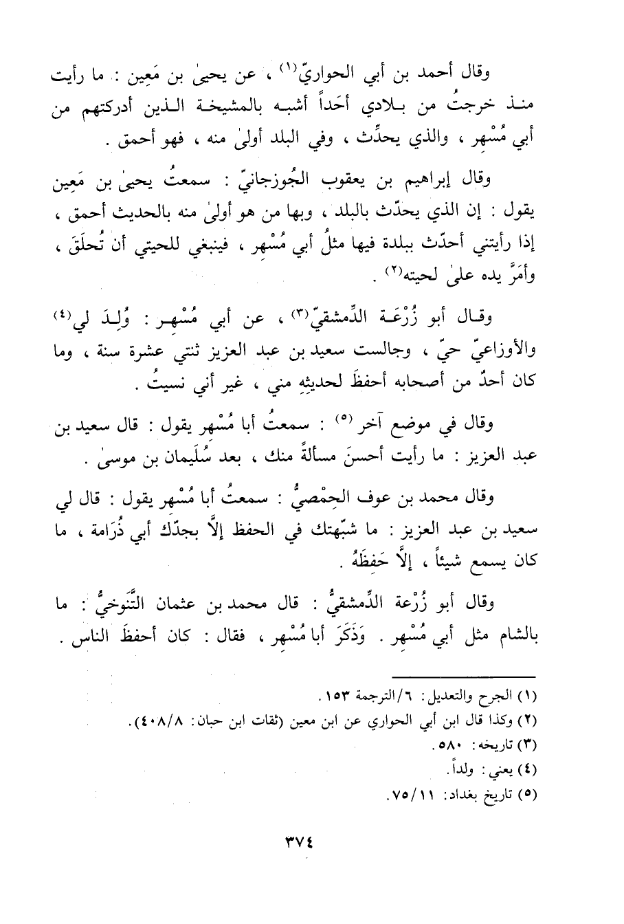 وَقَال أَبُو زُرْعَة الدمشقي: قال مُحَمَّد بْن عُثْمَان التنوخي: ما بالشام مثل أبي مسهر. وذكر أبا مسهر، فَقَالَ: كَانَ أحفظ الناس.