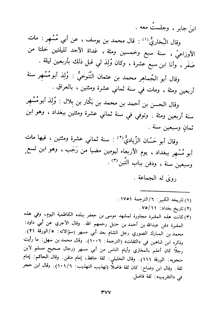 (3) كانت هذه المقبرة مجاورة لمشهد موسى بن جعفر ببلده الكاظمية اليوم، وفي هذه المقبرة دفن عَبد اللَّهِ بْن أَحْمَد بْن حنبل رحمهم الله. وَقَال الآجري عَن أبي داود: مُحَمَّد بن المبارك الصوري رجل الشام بعد أبي سمهر (سؤالاته: 5 / الورقة 21) ، وذَكَره ابن شاهين في "الثقات" (الترجمة: 1006) . وَقَال محمد بن سهل: ما رأيت رجلا كان أعلم بالمغازي وأيام الناس من أبي مسهر (رجال صحيح مسلم لابن منجويه: الورقة 111) .
