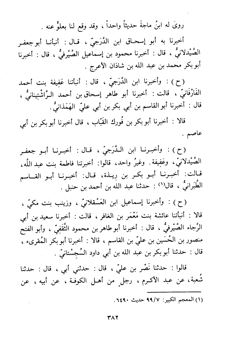 وغَيْرُ واحِدٍ، قَالُوا: أَخْبَرَتْنا فَاطِمَةُ بِنْتُ عَبد اللَّهِ، قَالَتْ: أخبرنا أَبُو بَكْرِ بْنِ رِيذَةَ، قال: أخبرنا أَبُو الْقَاسِم الطبراني، قال (1) : حَدَّثَنَا عَبد اللَّهِ بْن أَحْمَد بْن حنبل.
