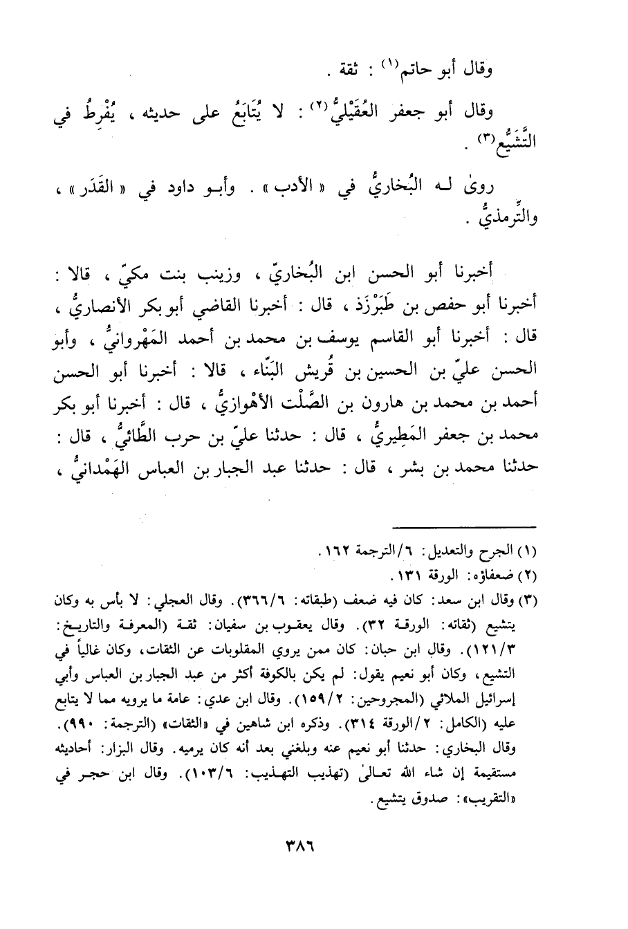 وَقَال أَبُو جعفر العقيلي (2) : لا يتابع علي حديثه، يفرط فِي التشيع (3) .
