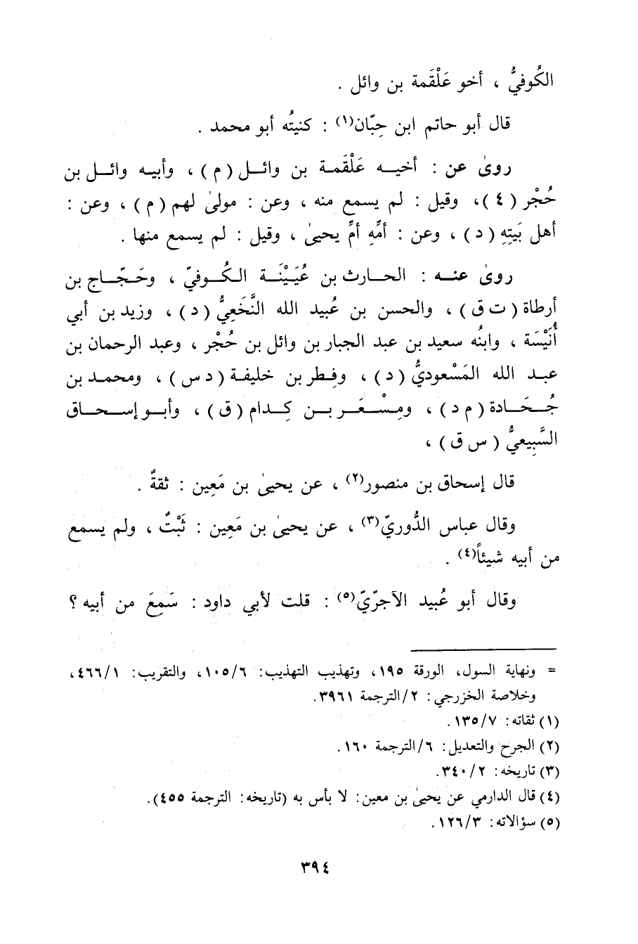 = ونهاية السول، الورقة 195، وتهذيب التهذيب: 6 / 105، والتقريب: 1 / 466، وخلاصة الخزرجي: 2 / الترجمة 3961.