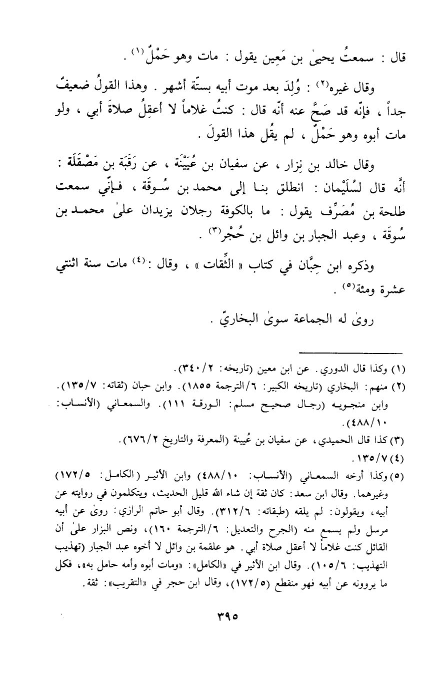 (5) وكذا أرخه السمعاني (الانساب: 10 / 488) وابن الاثير (الكامل: 5 / 172) وغيرهما. وَقَال ابن سعد: كان ثقة إن شاء الله قليل الحديث، ويتكلمون في روايته عَن أبيه، ويقولون: لم يلقه (طبقاته: 6 / 312) . وَقَال أبو حاتم الرازي: روى عَن أبيه مرسل ولم يسمع منه (الجرح والتعديل: 6 / الترجمة 160) ، ونص البزار على أن القائل كنت غلاما لا أعقل صلاة ابي. هو علقمة بن وائل لا أخوه عبد الجبار (تهذيب التهذيب: 6 / 105) . وَقَال ابن الاثير في "الكامل": ومات أبوه وأمه حامل به"، فكل ما يروونه عَن أبيه فهو منقطع (5 / 172) ، وَقَال ابن حجر في "التقريب": ثقة.