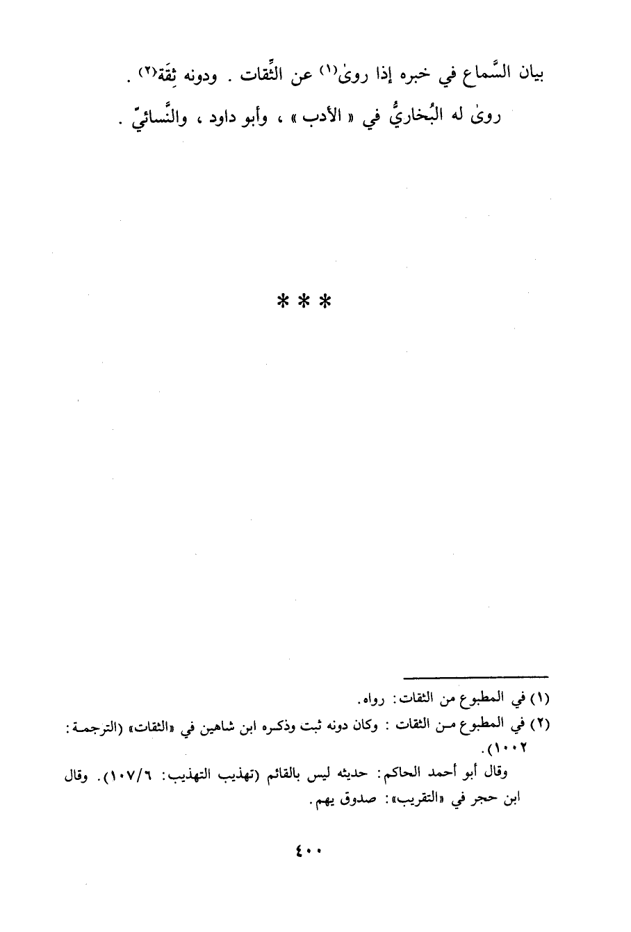 بيان السماع فِي خبره إِذَا روى (1) عن الثقات. ودونه ثقة (2) .