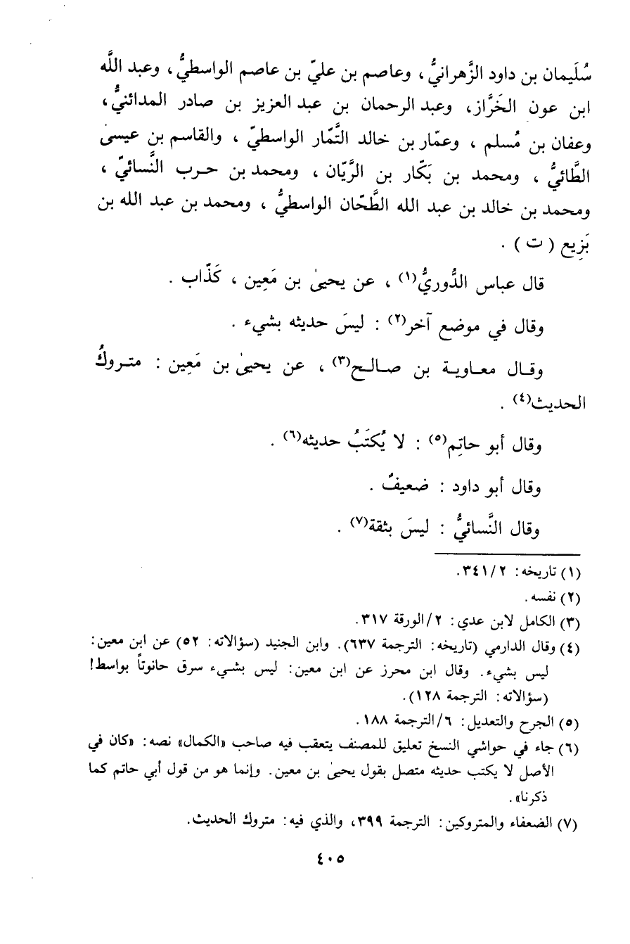 (4) وَقَال الدارمي (تاريخه: الترجمة 637) . وابن الجنيد (سؤالاته: 52) عن ابن مَعِين: ليس بشيءٍ. وَقَال ابن محرز عن ابن مَعِين: ليس بشيءٍ سرق حانوتا بواسط! (سؤالاته: الترجمة 128) .