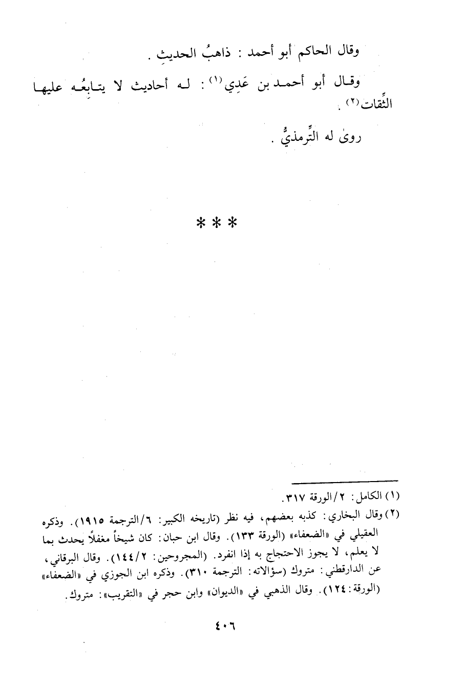 (2) وقَال البُخارِيُّ: كذبه بعضهم، فيه نظر (تاريخه الكبير: 6 / الترجمة 195) ، وذَكَره العقيلي في "الضعفاء" (الورقة 133) . وَقَال ابن حبان: كان شيخا مغفلا يحدث بما لا يعلم، لا يجوز الاحتجاج به إذا انفرد.