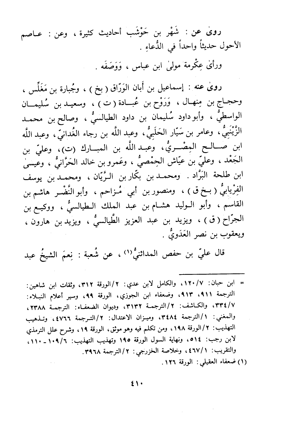 (1) ابن حبان: 7 / 120، والكامل لابن عدي: 2 / الورقة 312، وثقات ابن شاهين: الترجمة 911، 913، وضعفاء ابن الجوزي، الورقة 99، وسير أعلام النبلاء: 7 / 334، والكاشف: 2 / الترجمة 3132، وديوان الضعفاء: الترجمة 2388، والمغني: 1 / الترجمة 3484، وميزان الاعتدال: 2 / الترجمة 4766، وتذهيب التهذيب: 2 / الورقة 198، ومن تكلم فيه وهو موثق، الورقة 19، وشرح علل التِّرْمِذِيّ لابن رجب: 514، ونهاية السول الورقة 195 وتهذيب التهذيب: 6 / 109 - 110، والتقريب: 1 / 467، وخلاصة الخزرجي: 2 / الترجمة 3968.