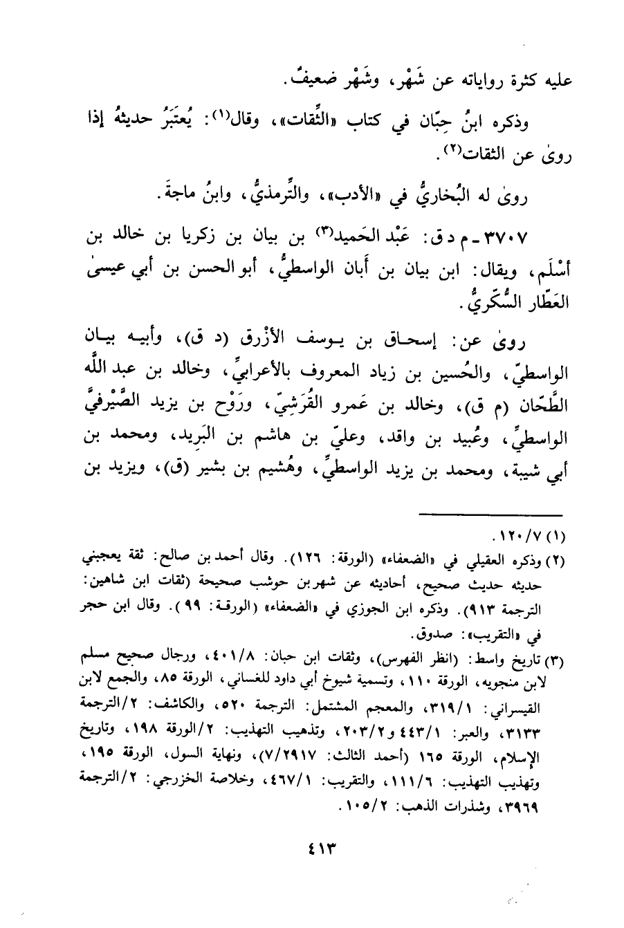 (3) تاريخ واسط:،، وثقات ابن حبان: 8 / 401، ورجال صحيح مسلم لابن منجويه، الورقة 110، وتسمية شيوخ أبي داود للغساني، الورقة 85، والجمع لابن القيسراني: 1 / 319، والمعجم المشتمل: الترجمة 520، والكاشف: 2 / الترجمة 3133، والعبر: 1 / 443 و2 / 203، تذهيب التهذيب: 2 / الورقة 198، وتاريخ الاسلام، الورقة 165 (أحمد الثالث: 2917 / 7) ، ونهاية السول، الورقة 195، وتهذيب التهذيب: 6 / 111، والتقريب: 1 / 467، والتقريب: 1 / 467، وخلاصة الخزرجي: 2 / الترجمة 3969، وشذرات الذهب: 2 / 105.