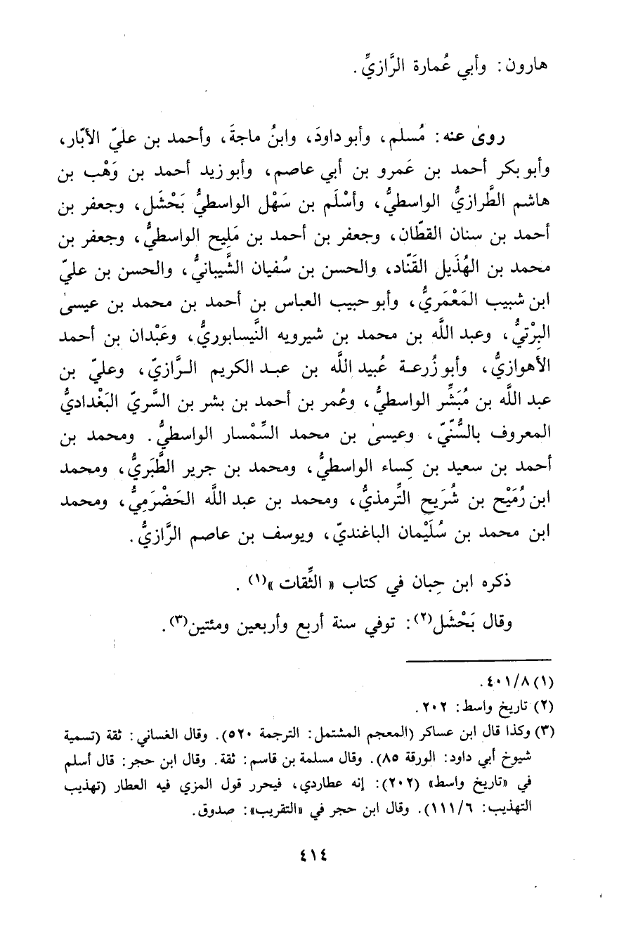 (3) وكذا قال ابن عساكر (المعجم المشتمل: الترجمة 520) . وَقَال الغساني: ثقة (تسمية شيوخ أبي داود: الورقة 85) . وَقَال مسلمة بن قاسم: ثقة. وَقَال ابن حجر: قال أسلم في "تاريخ واسط" (202) : إنه عطاردي، فيحرر قول المزي فيه العطار (تهذيب التهذيب: 6 / 111) . وَقَال ابن حجر في "التقريب": صدوق.