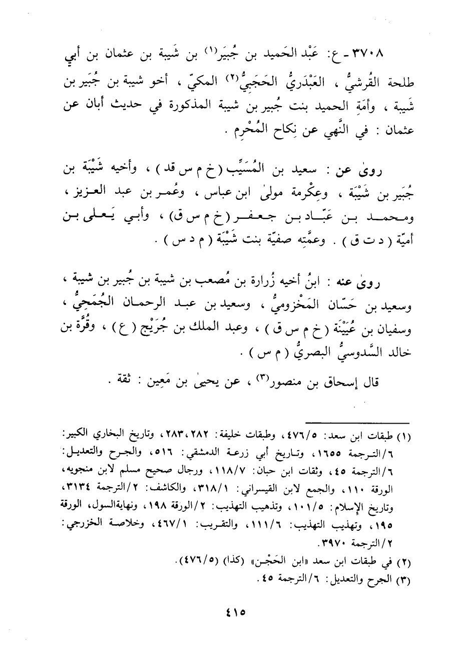 3708 - ع: عبد الحميد بن جبير بن شَيْبَة بن عُثْمَان بن أَبي طلحة القرشي (1) ، العبدري الحجبي (2) المكي، أخو شَيْبَة بْن جبير بْن شَيْبَة، وأمه الحميد بنت جبير بْن شَيْبَة المذكورة فِي حديث أبان عَنْ عُثْمَان: فِي النهي عَنْ نكاح المحرم.