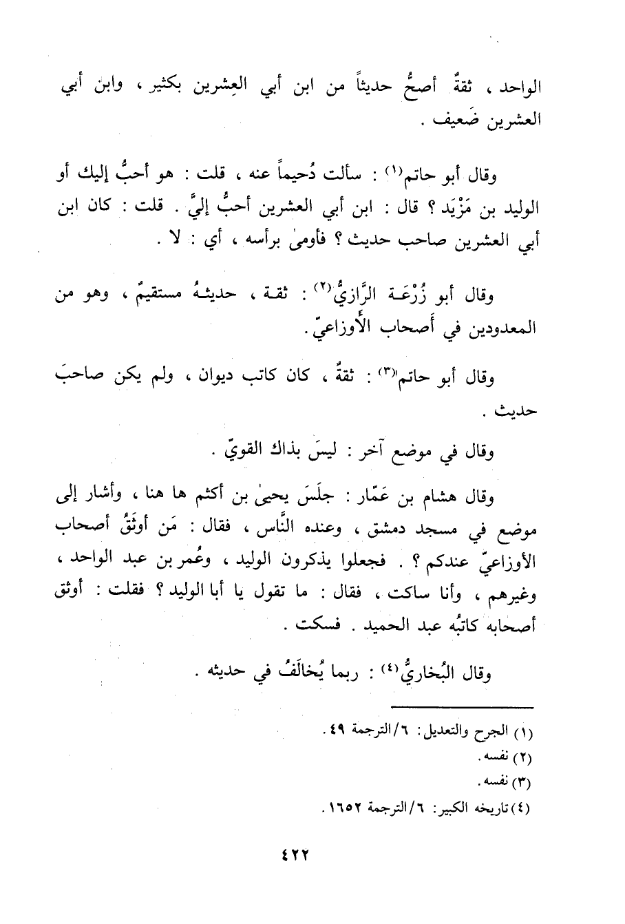 وَقَال أَبُو حَاتِم (1) : سألت دحيما عنه، قلت: هُوَ أحب إليك أَوِ الوليد بْن مزيد؟ قال: ابْن أَبي العشرين أحب إلي. قلت: كَانَ ابْن أَبي العشرين صاحب حديث؟ فأومى براسه، أي: لا.
