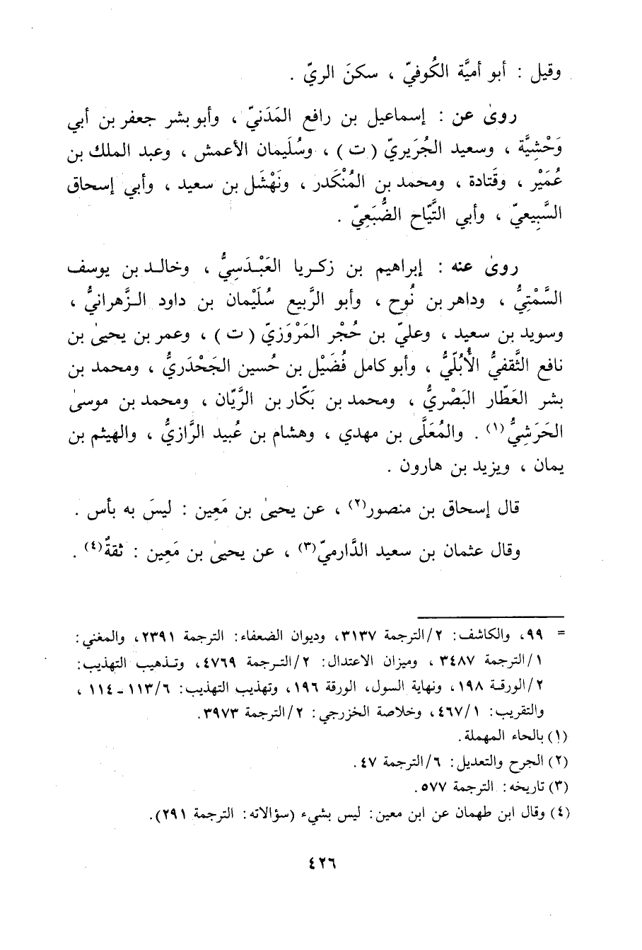 = 99، والكاشف: 2 / الترجمة 3137، وديوان الضعفاء: الترجمة 2391، والمغني: 1 / الترجمة 3487، وميزان الاعتدال: 2 / الترجمة 4769، وتذهيب التهذيب: 2 / الورقة 198، ونهاية السول، الورقة 196، وتهذيب التهذيب: 6 / 113 - 114، والتقريب: 1 / 467، وخلاصة الخزرجي: 2 / الترجمة 3973.