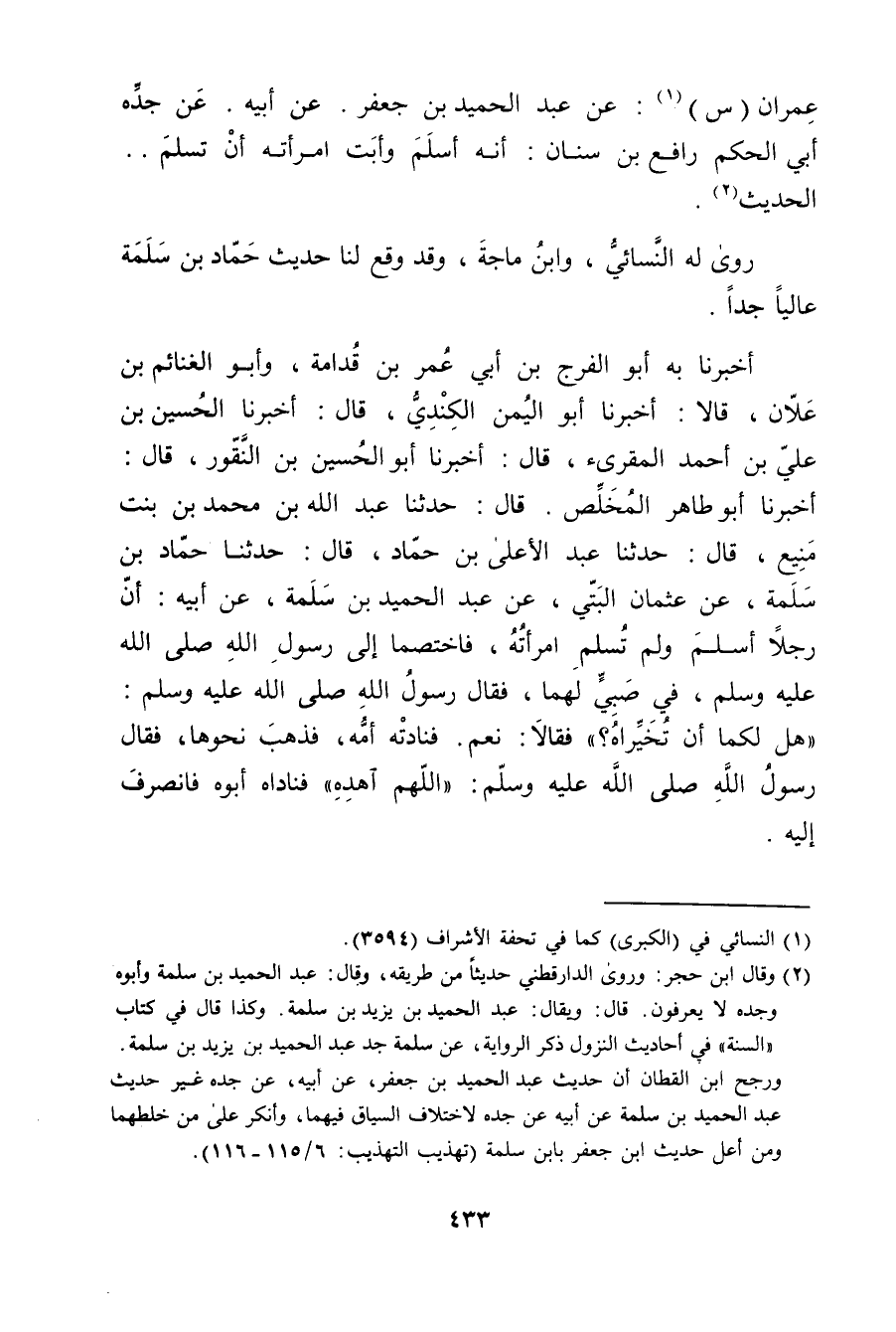 أَخْبَرَنَا بِهِ أَبُو الْفَرَجِ بْنُ أَبي عُمَر بْن قدامة، وأبو الْغَنَائِمِ بْنُ عَلانَ، قَالا: أَخْبَرَنَا أَبُو اليُمْنِ الْكِنْدِيُّ، قال: أَخْبَرَنَا الْحُسَيْنُ بْنُ عَلِيِّ بْنِ أَحْمَدَ الْمُقْرِئُ، قال: أَخْبَرَنَا أَبُو الْحُسَيْنِ بْن النقور، قال: أَخْبَرَنَا أبو طَاهِرٍ الْمُخَلِّصُ. قال: حَدَّثَنَا عَبد الله بن محمد بن بنت منيع، قال: حَدَّثَنَا عبد الاعلى بن حماد، قال: حَدَّثَنَا مُحَمَّدُ بْنُ سَلَمَةَ، عن عثمان البتي، عن عبد الحميد بْن سلمة، عَن أبيه: أن رجلا أسلم ولم تسلم امرأته، فَاخْتَصَمَا إِلَى رَسُولِ اللَّهِ صلى الله عليه وسلم، فِي صَبِيٍّ لَهُمَا، فَقَالَ رَسُولُ اللَّهِ صلى الله عليه وسلم: هَلْ لَكُمَا أَنْ تُخَيِّرَاهُ؟ "فَقَالا: نَعَمْ. فَنَادَتْهُ أُمُّهُ، فَذَهَبَ نَحْوَهَا، فَقَالَ رَسُولُ اللَّهِ صلى الله عليه وسلم: اللَّهُمَّ اهْدِهِ"فَنَادَاهُ أَبُوهُ فَانْصَرَفَ إليه.