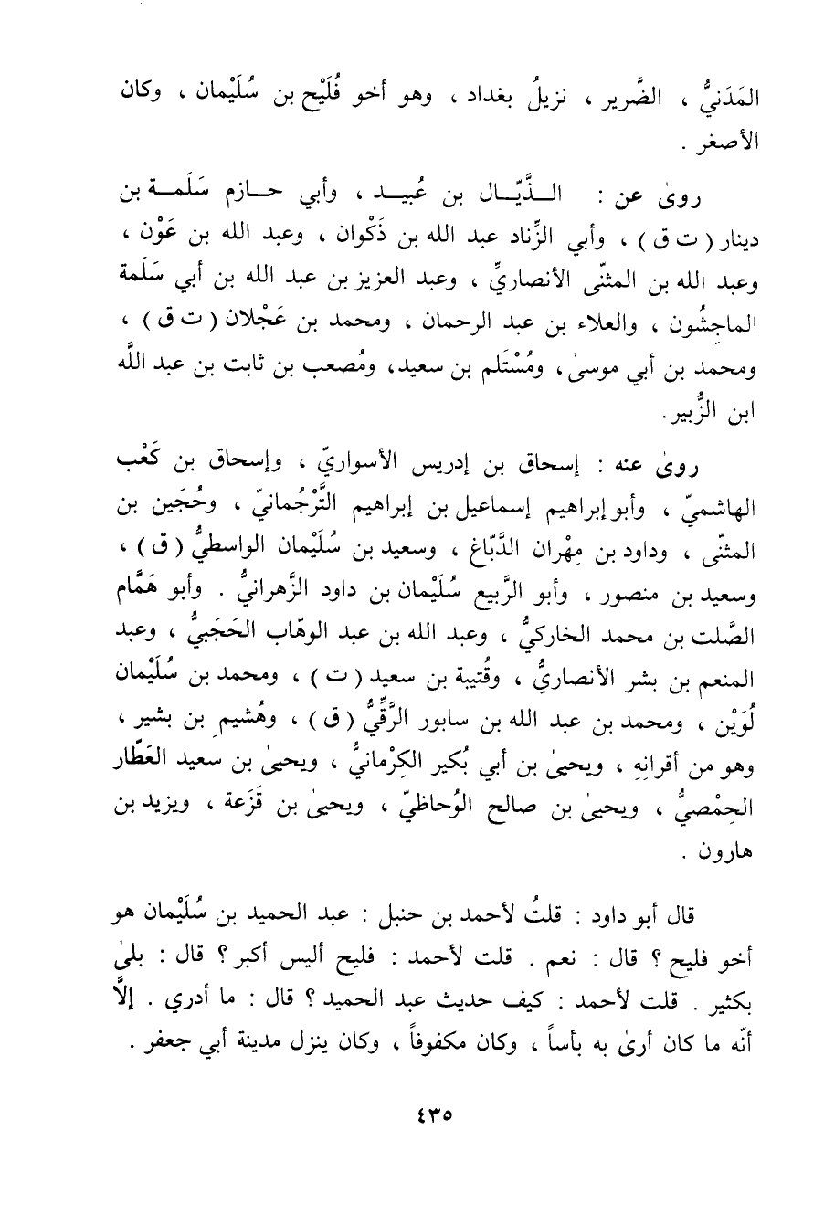 قال أَبُو دَاوُدَ: قلت لأحمد بن حنبل: عبد الحميد بْن سُلَيْمان هُوَ أخو فليح؟ قال: نعم. قلت لأحمد: فليح أليس أكبر؟ قال: بلي بكثير. قلت لأحمد: كيف حديث عبد الحميد؟ قال: ما أدري. إلا أنه ما كَانَ أري بِهِ بأسا، وكَانَ مكفوفا، وكَانَ ينزل مدينة أبي جَعْفَر.