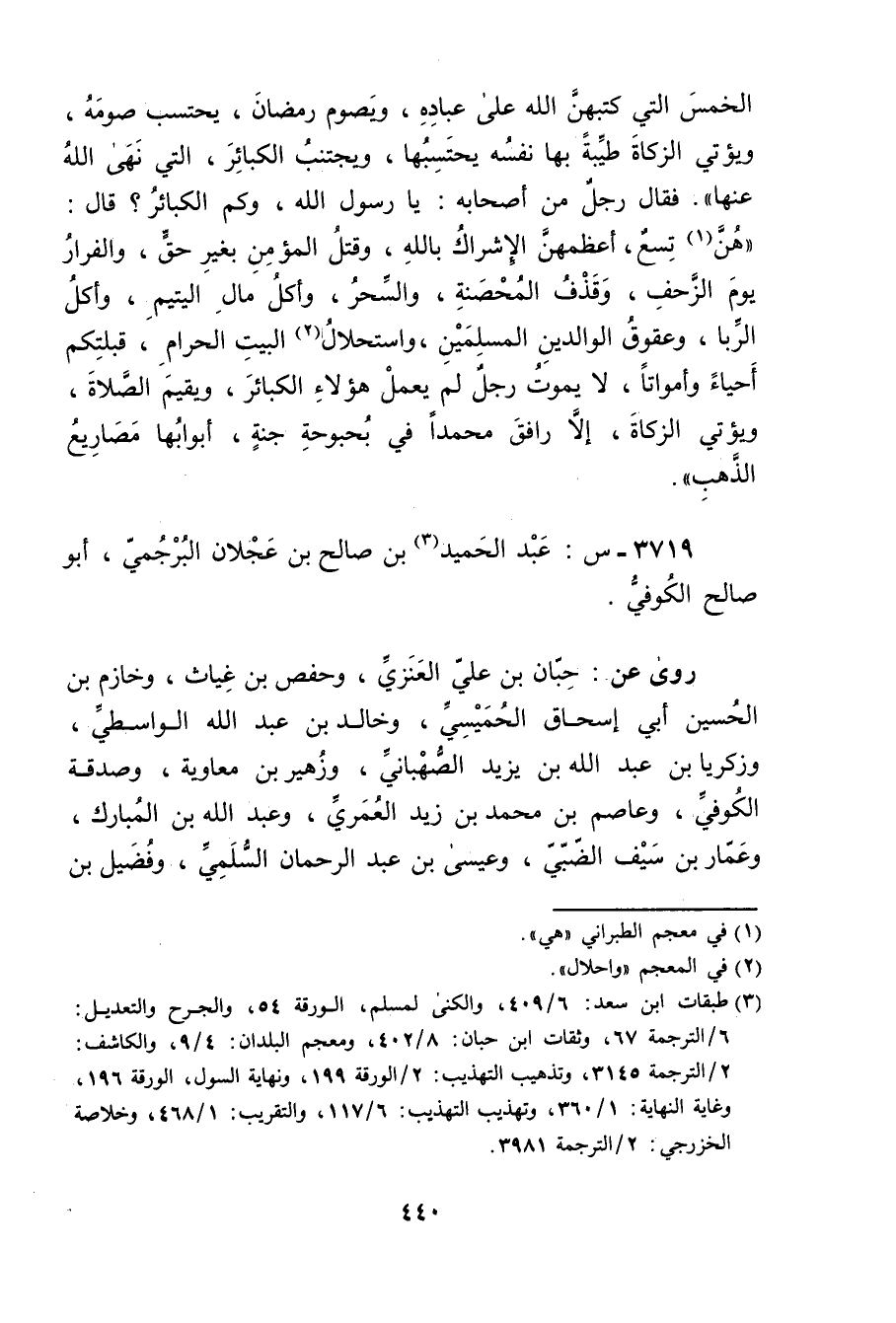 فَقَالَ رَجُلٌ مِنْ أَصْحَابِهِ: يَا رَسُولَ اللَّهِ، وكَمِ الْكَبَائِرُ؟ قال: هُنَّ (1) تِسْعٌ، أَعْظَمُهُنَّ الإِشْرَاكُ بِاللَّهِ، وقَتْلُ الْمُؤْمِنِ بِغَيْرِ حَقٍّ، والْفِرَارُ يَوْمَ الزَّحْفِ، وقَذْفُ الْمُحْصَنَةِ، والسِّحْرُ، وأَكْلُ مَالِ الْيَتِيمِ، وأَكْلُ الرِّبَا، وعُقُوقُ الْوَالِدَيْنِ الْمُسْلِمَيْنِ، واسْتِحْلالُ (2) الْبَيْتِ الْحَرَامِ، قِبْلَتُكُمْ أَحْيَاءً وأَمْوَاتًا، لا يَمُوتُ رَجُلٌ لَمْ يَعْمَلْ هَؤُلاءِ الْكَبَائِرَ، ويُقِيمُ الصَّلاةَ، ويُؤْتِي الزَّكَاةَ، إِلا رَافَقَ مُحَمَّدًا فِي بُحْبُوحَةِ جَنَّةٍ، أَبْوَابُهَا مَصَارِيعُ الذهب.
