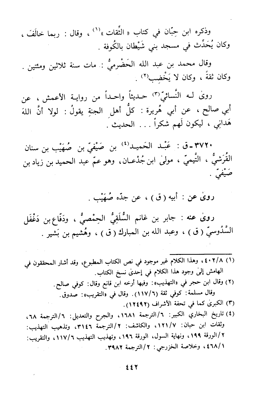 (2) وَقَال ابن حجر في "التهذيب": وفيها أرخه ابن قانع وَقَال: كوفي صالح. وَقَال مسلمة: كوفي ثقة (6 / 117) . وَقَال في "التقريب": صدوق.
