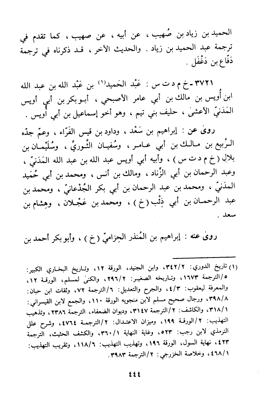 3721 - خ م د ت س: عبد الحميد بْن عَبد اللَّهِ بْن عَبد اللَّهِ بن أويس بن مالك بن أَبي عامر الأصبحي (1) ، أَبُو بَكْرِ بن أَبي أويس المدني الأعشى، حليف بني تيم، وهُوَ أخو إِسْمَاعِيل بْن أَبي أويس.
