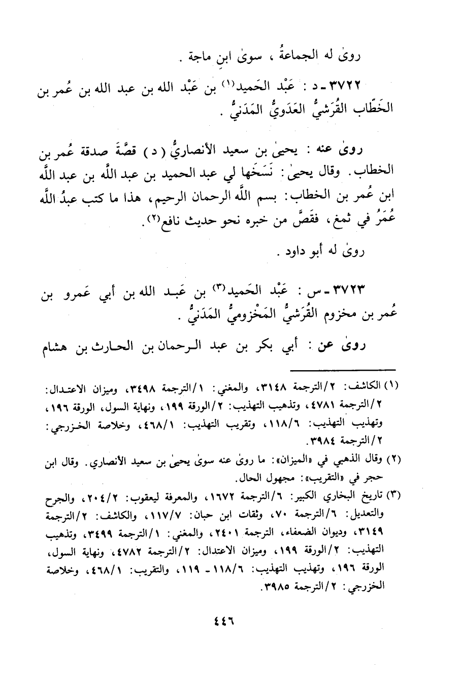 3722 - د: عبد الحميد بْن عَبد اللَّهِ بْن عَبد اللَّهِ بْن عُمَر بْن الخطاب القرشي العدوي المدني (1) .