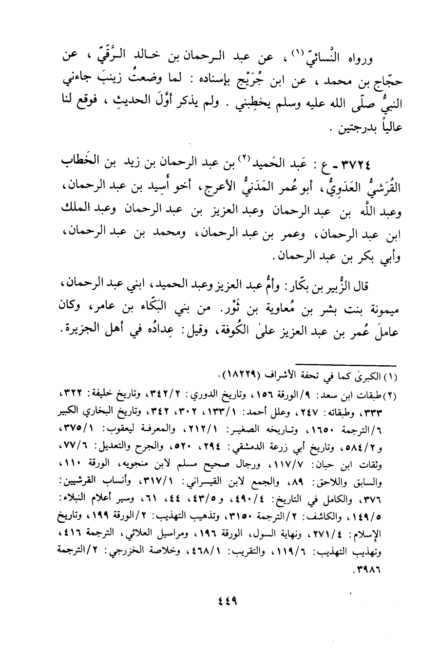 3724 - ع: عبد الحميد بن عَبْد الرحمن بن زيد بن الخطاب القرشي العدوي (2) ، أَبُو عُمَر المدني الأعرج، أخو أسيد بْن عَبْد الرحمن، وعبد الله بْن عَبْد الرَّحْمَنِ وعبد العزيز بْن عَبْدِ الرَّحْمَنِ وعبد الملك ابن عَبْد الرَّحْمَنِ، وعُمَر بن عَبْدِ الرَّحْمَنِ، ومُحَمَّد بْن عَبْدِ الرَّحْمَنِ، وأبي بكر بْن عَبْد الرحمن.
