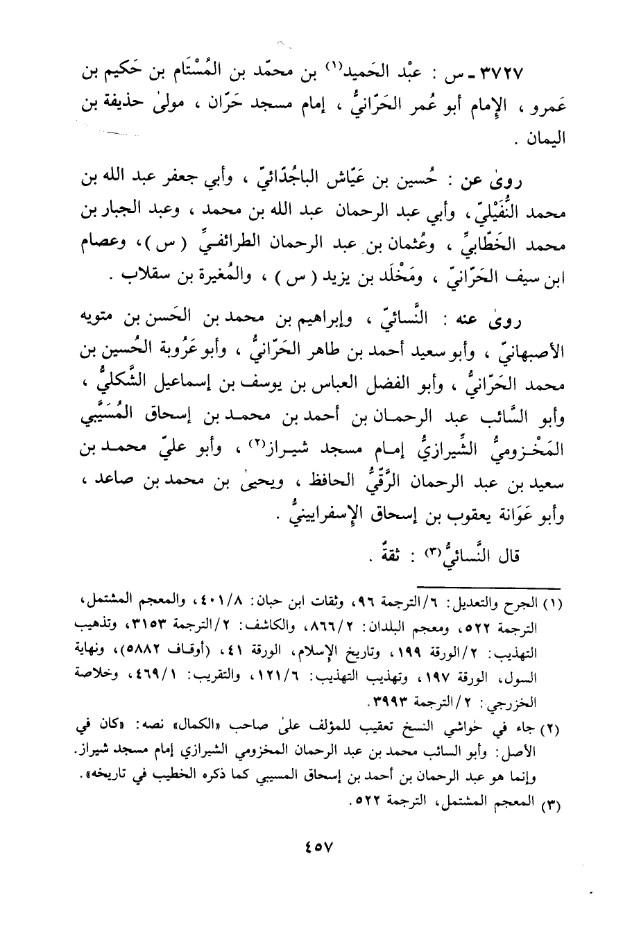 3727 - س: عبد الحميد بن مُحَمَّد بن المستام بن حكيم بن عَمْرو (1) ، الإمام أَبُو عُمَر الحراني، إمام مسجد حران، مولى حذيفة بْن اليمان.