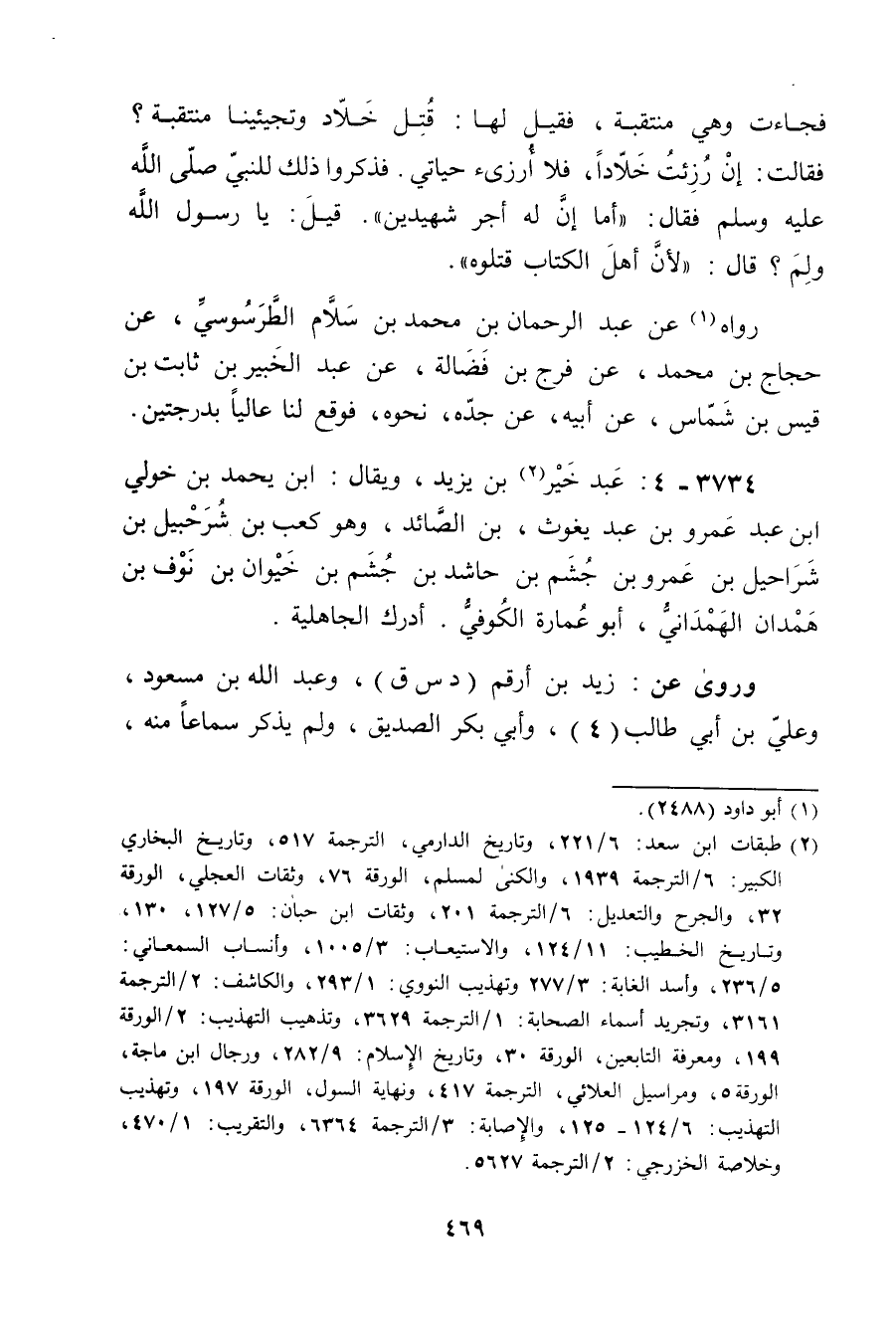3734 - 4: عبد خير بن يَزِيدَ (2) ، ويُقال: ابن يحمد بن خولي ابن عبد عَمْرو بْن عبد يغوث، بْن الصائد، وهُوَ كعب بْن شرحبيل بْن شراحيل بْن عَمْرو بْن جشم بْن حاشد بْن جشم بْن خيوان بْن نوف بْن همدان الْهَمْدَانِيّ، أَبُو عمارة الكوفي. أدرك الجاهلية.