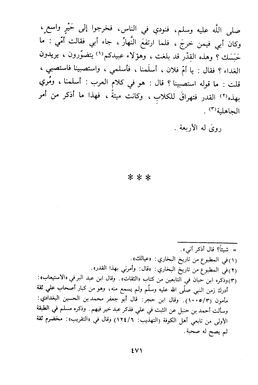صَلَّى الله عليه وسلم، فتودي في الناس، فخرجوا إلى حير واسع، وكَانَ أبي فيمن خرج، فلما ارتفع النهار، جاء أبي فقالت أمي: ما حبسك؟ وهَذِهِ القدر قد بلغت، وهؤلاء عُبَيدكم (1) يتضورون، يريدون الغداء؟ فَقَالَ: يَا أم فلان، أسلمنا، فأسلمي، واستصبينا فاستصبي، قلت: ما قوله استصبينا؟ قال: هُوَ فِي كلام العرب: أسلمنا، ومري بهذه (2) القدر فتهراق للكلاب، وكانت ميتة، فهذا ما أذكر من أمر الجاهلية (3) .