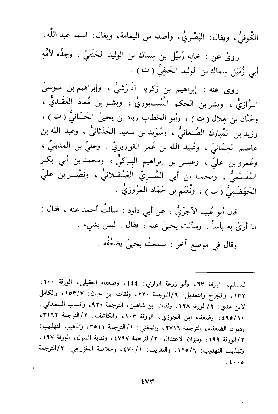 = لمسلم، الورقة 63، وأبو زُرْعَة الرازي: 444، وضعفاء العقيلي، الورقة 100، 132، والجرح والتعديل: 6 / الترجمة 220، وثقات ابن حبان: 7 / 153، والكامل لابن عدي: 2 / الورقة 128، وثقات ابن شاهين، الترجمة 920، وأنساب السمعاني: 10 / 495، وضعفاء ابن الجوزي، الورقة 103، والكاشف: 2 / الترجمة 3162، وديوان الضعفاء، الترجمة 2716، والمغني: 1 / الترجمة 3511، وتذهيب التهذيب: 2 / الورقة 199، وميزان الاعتدال: 2 / الترجمة 4797، ونهاية السول، الورقة 197، وتهذيب التهذيب: 6 / 125، والتقريب: 1 / 470، وخلاصة الخزرجي: 2 / الترجمة 4005.