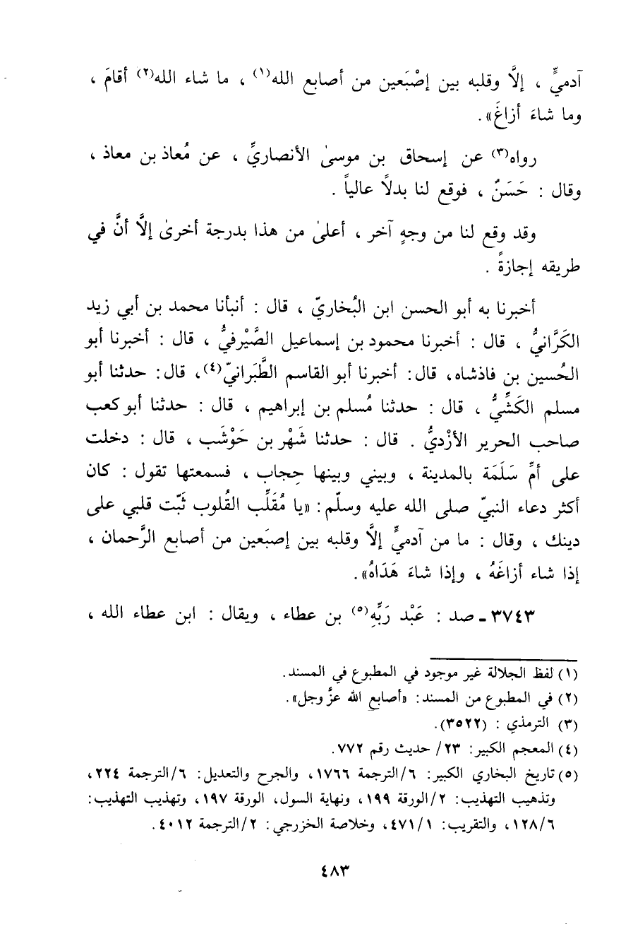 أَخْبَرَنَا بِهِ أَبُو الْحَسَنِ بْنُ الْبُخَارِيِّ، قال: أَنْبَأَنَا مُحَمَّدُ بْنُ أَبي زَيْدٍ الْكَرَّانِيُّ، قال: أَخْبَرَنَا مَحْمُودُ بْنُ إِسْمَاعِيلَ الصَّيْرَفِيُّ، قال: أخبرنا أَبُو الحسين بْن فَاذْشْاهِ، قال: أخبرنا أَبُو الْقَاسِمِ الطَّبَرَانِيُّ (4) ، قال: حَدَّثَنَا أَبُو مُسْلِمٍ الْكَشِّيُّ، قال: حَدَّثَنَا مُسْلِمُ بْنُ إِبْرَاهِيمَ، قال: حَدَّثَنَا أَبُو كَعْبٍ صَاحِبُ الْحَرِيرِ الأَزْدِيُّ. قال: حَدَّثَنَا شَهْرُ بْنُ حَوْشَبٍ، قال: دَخَلْتُ عَلَى أُمِّ سَلَمَةَ بِالْمَدِينَةِ، وبَيْنِي وبَيْنَهَا حِجَابٌ، فَسَمِعْتُهَا تَقُولُ: كَانَ أَكْثَرُ دُعَاءِ النَّبِيِّ صلى الله عليه وسلم: يَا مُقَلِّبَ الْقُلُوبِ ثَبِّتْ قَلْبِي عَلَى دِينِكَ، وَقَال: مَا مِنْ آدَمِيٍّ إِلا وقَلْبُهُ بَيْنَ إِصْبَعَيْنِ مِنْ أَصَابِعِ الرَّحْمَنِ، إِذَا شَاءَ أَزَاغَهُ، وإِذَا شَاءَ هَدَاهُ.