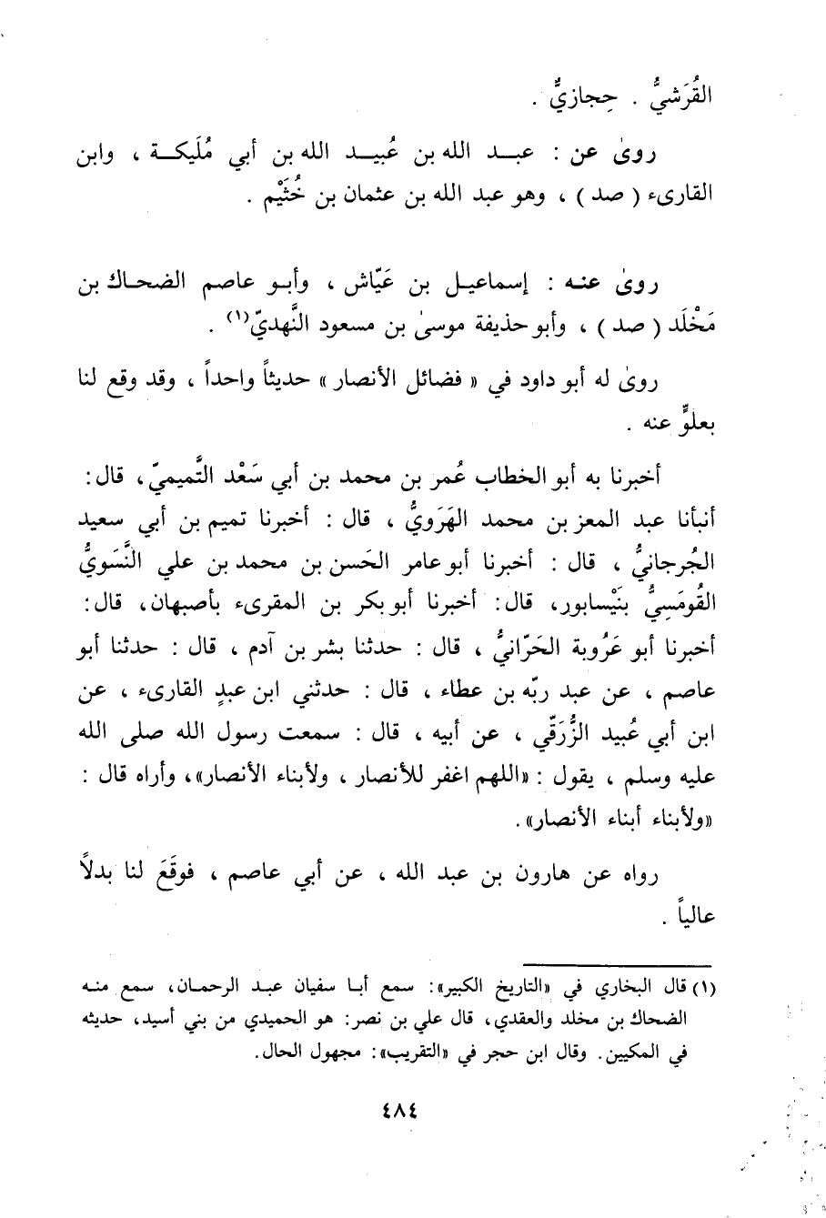 أَخْبَرَنَا بِهِ أَبُو الْخَطَّابِ عُمَر بْنُ مُحَمَّدٍ بْنِ أَبي سَعْدٍ التَّمِيمِيُّ، قال: أَنْبَأَنَا عَبْدُ الْمُعِزِّ بْنُ مُحَمَّدٍ الْهَرَوِيُّ، قال: أَخْبَرَنَا تَمِيمُ بْنُ أَبي سَعِيد الْجُرْجَانِيُّ، قال: أخبرنا أبو عامر الحسن بن محمد بْنِ عَلِيٍّ النَّسَوِيُّ الْقُومِسِيُّ بِنَيْسَابُورَ، قال: أَخْبَرَنَا أبو بكر بْن الْمُقْرِئِ بَأَصْبَهَانَ، قال: أخبرنا أَبُو عَرُوبَة الْحَرَّانِيُّ، قال: حَدَّثَنَا بِشْرُ بن آدم، قال: حَدَّثَنَا أبوعاصم، عَنْ عَبْدِ رَبِّهِ بْنِ عَطَاءٍ، قال: حدثني ابن عبد القارئ، عَنِ ابْنِ أَبي عُبَيد الزَرْقِيِّ، عَن أَبِيهِ، قال: سَمِعْتُ رَسُولَ اللَّهِ صلى الله عليه وسلم، يَقُولُ: اللَّهُمَّ اغْفِرْ لِلأَنْصَارِ، ولأَبْنَاءِ الأَنْصَارِ"، وأَرَاهُ قال: ولأَبْنَاءِ أَبْنَاءِ الأَنْصَارِ.