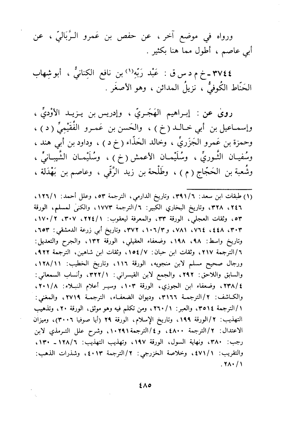 3744 - خ م د س ق: عبد ربه بن نافع الكناني (1) ، أَبُو شهاب الحناط الكوفي، نزيل المدائن، وهُوَ الأصغر.