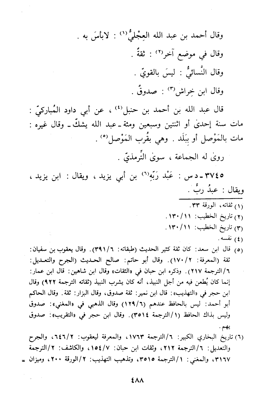 (6) تاريخ البخاري الكبير: 6 / الترجمة 1763، والمعرفة ليعقوب: 2 / 646، والجرح والتعديل: 6 / الترجمة 212، وثقات ابن حبان: 7 / 154، والكاشف: 2 / الترجمة 3167، والمغني: 1 / الترجمة 3515، وتذهيب التهذيب: 2 / الورقة 200، وميزان =