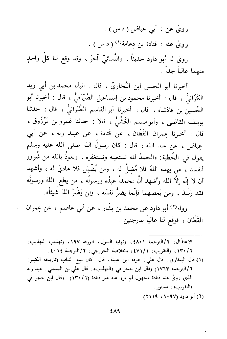 أخبرنا أَبُو الْحَسَنِ بْنُ الْبُخَارِيِّ، قال: أَنْبَأَنَا مُحَمَّدِ بْنِ أَبي زَيْدٍ الْكَرَّانِيِّ، قال: أَخْبَرَنَا مَحْمُودُ بْنُ إِسْمَاعِيلَ الصَّيْرَفِيُّ، قال: أخبرنا أَبُو الْحُسَيْنِ بْنِ فَاذْشْاهِ، قال: أخبرنا أَبُو القاسم الطبراني، قال: حَدَّثَنَا بوسف الْقَاضِي، وأَبُو مُسْلِمٍ الْكَشِّيُّ، قَالا: حَدَّثَنَا عَمْرو بن مرزوق، قال: أخبرنا عِمْران الْقَطَّانُ، عَنْ قَتَادَةَ، عَنْ عَبْدِ رَبِّهِ، عَن أَبِي عِيَاضٍ، عَنْ عَبد اللَّهِ، قال: كان رَسُول اللَّهِ صَلَّى اللَّهُ عليه وسلم يَقُولُ فِي الْخُطْبَةِ: الْحَمْدُ لِلَّهِ نَسْتَعِينُهُ ونَسْتَغْفِرُهُ، ونَعُوذُ بِاللَّهِ مِنْ شُرُورِ أَنْفُسِنَا، مَنْ يهده اللَّهُ فَلا مُضِلَّ لَهُ، ومَنْ يُضْلِلْ فَلا هَادِي لَهُ، وأَشْهَدُ أن لا إله إلا اللَّه وأَشْهَدُ أَنَّ مُحَمَّدًا عَبْدُهُ ورَسُولُهُ، مَنْ يُطِعِ اللَّهَ ورَسُولَهُ فَقَدْ رَشُدَ، ومَنْ يَعْصَهُمَا فَإِنَّمَا يَضُرُّ نَفْسَهُ، ولَنْ يَضُرَّ اللَّهَ شَيْئًا.