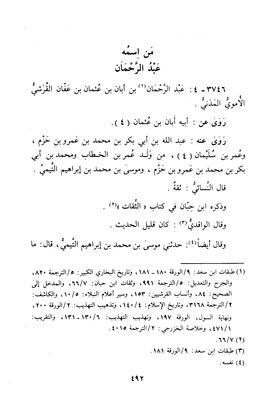 3746 - 4: عَبْد الرحمن بْن أبان بْن عثمان بن عفان القرشي الأُمَوِي المدني (1) .