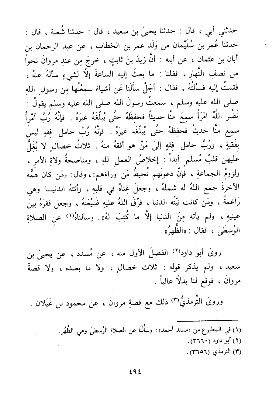 حَدَّثني أَبِي، قال: حَدَّثَنَا يَحْيَى بْنُ سَعِيد، قال: حَدَّثَنَا شُعْبَةُ، قال: حَدَّثَنَا عُمَر بْنُ سُلَيْمان من ولد عُمَر بن الخطاب، عَنْ عَبْدِ الرَّحْمَنِ بْنِ أَبَانِ بْنِ عُثْمَانَ، عَن أَبِيهِ: أَنَّ زَيْدَ بْنَ ثَابِتٍ، خَرَجَ مِنْ عِنْدِ مَرْوَانَ نَحْوًا مِنْ نِصْفِ النَّهَارِ، فَقُلْنَا: مَا بَعَثَ إِلَيْهِ الساعة إلا لشئ سَأَلَهُ عَنْهُ، فَقُمْتُ إِلَيْهِ فَسَأَلْتُهُ، فَقَالَ: أَجَلْ سَأَلْنَا عَنْ أَشْيَاءَ سَمِعْتُهَا مِنْ رَسُولِ اللَّهِ صَلَّى الله عليه وسلم، سَمِعْتُ رَسُولَ اللَّهِ صلى الله عليه وسلم يقول: نضر الله امرءا سَمِعَ مِنَّا حَدِيثًا فَحَفِظَهُ حَتَّى يبلغه غيره. فإنه رب امرءا سَمِعَ مِنَّا حَدِيثًا فَحَفِظَهُ حَتَّى يُبَلِّغَهُ غَيْرَهُ. فَإِنَّهُ رُبَّ حَامِلِ فِقْهٍ لَيْسَ بِفَقِيهٍ، ورُبَّ حَامِلِ فِقْهٍ إِلَى مَنْ هُوَ أَفْقَهُ منه. ثَلاثُ خِصَالٍ لا يُغَلُّ عَلَيْهِنَّ قَلْبُ مُسْلِمٍ أَبَدًا: إِخْلاصُ الْعَمَلِ لِلَّهِ، ومُنَاصَحَةُ ولاةِ الأَمْرِ، ولُزُومُ الْجَمَاعَةِ، فَإِنَّ دَعْوَتَهُمْ تُحِيطُ مِنْ ورَاءِهِمْ"، وَقَال: مَنْ كَانَ هَمُّهُ الآخِرَةُ جَمَعَ اللَّهُ لَهُ شَمْلَهُ، وجَعَلَ غِنَاهُ فِي قَلْبِهِ، وأَتَتْهُ الدُّنْيَا وهِيَ رَاغِمَةٌ، ومَنْ كَانَتْ نِيَّتُهُ الدُّنْيَا، فَرَّقَ اللَّهُ عَلَيْهِ ضَيْعَتَهُ، وجَعَلَ فَقْرَهَ بَيْنَ عَيْنَيْهِ، ولَمْ يَأْتِهِ مِنَ الدُّنْيَا إِلا مَا كُتِبَ لَهُ". وسَأَلْنَاهُ (1) عَنِ الصَّلاةِ الْوُسْطَى، فَقَالَ: الْظُهْرُ.
