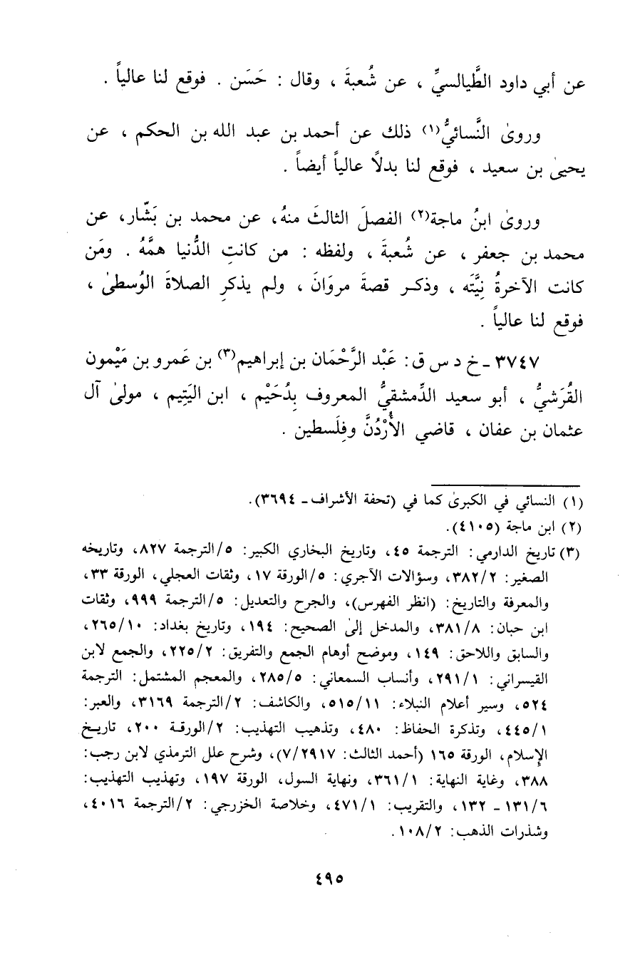 وروى النَّسَائي (1) ذَلِكَ عَنْ أَحْمَد بْن عَبد اللَّهِ بْن الحكم، عَنْ يَحْيَى بْن سَعِيد، فوقع لنا بدلا عاليا أيضا.