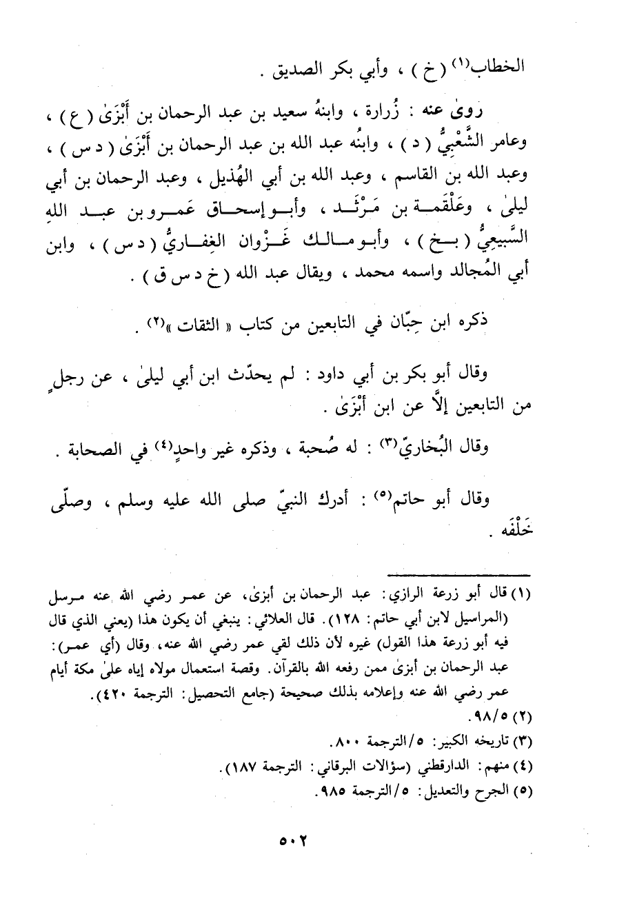 (1) قال أبو زُرْعَة الرازي: عَبْدِ الرَّحْمَنِ بْنِ أَبْزَى، عن عُمَر رضي الله عنه مرسل (المراسيل لابن أَبي حاتم: 128) . قال العلائي: ينبغي أن يكون هذا (يعني الذي قال فيه أبو زُرْعَة هذا القول) غيره لان ذلك لقي عُمَر رضي الله عنه، وَقَال (أي عُمَر) : عبد الرحمن بن أبزى ممن رفعه الله بالقرآن.