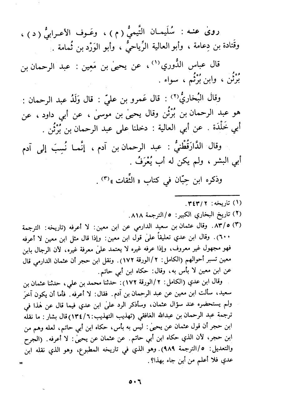 (3) 5 / 83. وَقَال عثمان بْن سَعِيد الدارمي عن ابن مَعِين: لا أعرفه (تاريخه: الترجمة 600) . وَقَال ابن عدي تعليقا على قول ابن مَعِين: إذا قال مثل ابن مَعِين لا أعرفه فهو مجهول غير معروف، وإذا عرفه غيره لا يعتمد لا يعتمد على معرفة غيره، لان الرجال بابن مَعِين تسبر أحوالهم (الكامل: 2 / الورقة 172) . ونقل ابن حجر أن عثمان الدارمي قال عن ابن مَعِين لا بأس به، وَقَال: حكاه ابن أَبي حاتم. وَقَال ابن عدي (الكامل: 2 / الورقة 172) : حَدَّثَنَا محمد بن علي، حَدَّثَنَا عثمان بن سَعِيد، سألت ابن مَعِين عن عبد الرحمن بن آدم. فقال: لا أعرفه. فأما أن يكون آخر ولم يستحضره عند سؤال عثمان، وسأذكر الرد على ابن عدي فيما قال عن هذا في ترجمة عبد الرحمن بن عَبد الله الغافقي (تهذيب التهذيب: 6 / 134) قال بشار: ما نقله ابن حجر أن قول عثمان عن يحيى: ليس به بأس، حكاه ابن أَبي حاتم، لعله وهم من ابن حجر، لان الذي حكاه ابن أَبي حاتم. عن عثمان عن يحيى: لا أعرفه. (الجرح والتعديل: 5 / الترجمة 989) . وهو الذي في تاريخه المطبوع، وهو الذي نقله ابن عدي فلا أعلم من أين جاء بهذا؟.