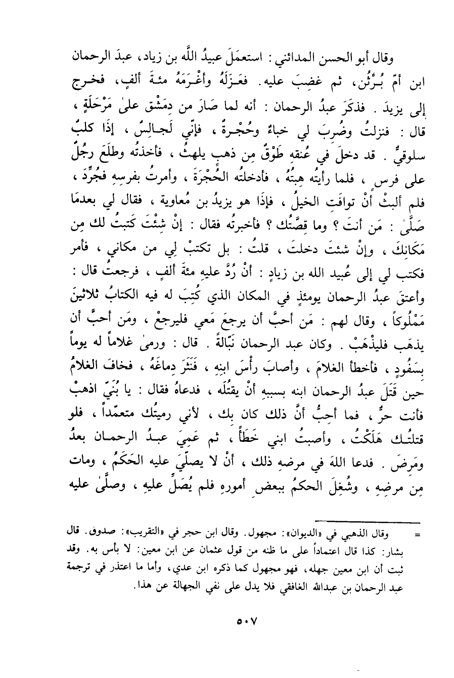 = وَقَال الذهبي في "الديوان": مجهول. وَقَال ابن حجر في "التقريب": صدوق. قال بشار: كذا قال اعتمادا على ما ظنه من قول عثمان عن ابن مَعِين: لا بأس به. وقد ثبت أن ابن مَعِين جهله، فهو مجهول كما ذكره ابن عدي، وأما ما اعتذر فِي ترجمة عَبْد الرَّحْمَنِ بْن عَبد الله الغافقي فلا يدل على نفي الجهالة عن هذا.