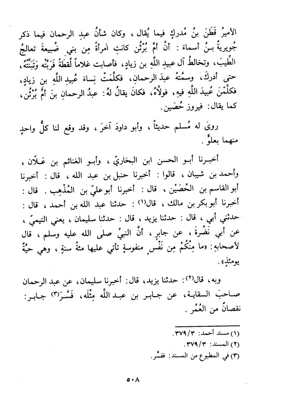 أَخْبَرَنَا أَبُو الْحَسَنِ بْنُ الْبُخَارِيِّ، وأبو الغنائم بْن علان، وأحمد بْنُ شَيْبَانَ، قَالُوا: أَخْبَرَنَا حَنْبَلُ بْن عَبد الله، قال: أَخْبَرَنَا أبو القاسم بْن الحصين، قال: أَخْبَرَنَا أبو علي بْن المذهب. قال: أَخْبَرَنَا أبو بكر بْن مالك، قال (1) : حَدَّثَنَا عَبد الله بْن أَحْمَدَ، قال: حَدَّثني أبي، قال: حَدَّثَنَا يَزِيدُ، قال: حَدَّثَنَا سُلَيْمان، يَعْنِي التَّيْمِيّ، عَن أَبِي نَضْرَةَ، عَنْ جَابِرٍ، أَنَّ النَّبِيَّ صلى الله عليه وسلم، قال لأَصْحَابِهِ: مَا مِنْكُمْ مِنْ نَفْسٍ منفوسة تأتي عليها مئة سَنَةٍ، وهِيَ حِيَّةٌ يَوْمَئِذٍ.