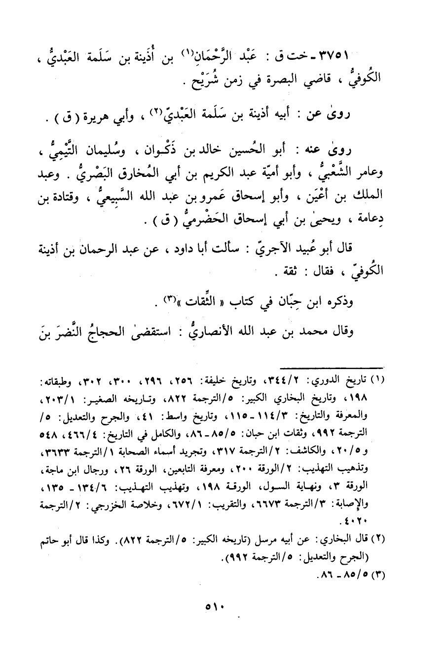 3751 - خت ق: عَبْد الرَّحْمَنِ بن أذينة بن سلمة العبدي (1) ، الكوفي، قاضي البصرة فِي زمن شريح.