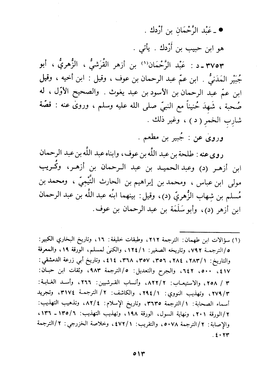 3753 - د: عَبْد الرَّحْمَنِ بن أزهر القرشي (1) ، الزُّهْرِيّ، أَبُو جبير المدني. ابْن عم عَبْد الرَّحْمَنِ بْن عوف، وقيل: ابْن أخيه، وقيل ابن عُمَر عَبْد الرحمن بْن الأسود بْن عبد يغوث. والصحيح الأول، لهُ صُحبَةٌ، شهد حنينا مَعَ النَّبِيّ صَلَّى اللَّهُ عَلَيْهِ وسَلَّمَ، ورَوَى عَنه: قصة شارب الخمر (د) ، وغير ذَلِكَ.