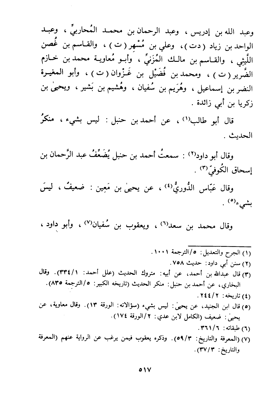 (3) قال عَبد اللَّهِ بْن أَحْمَد، عَن أبيه: متروك الحديث (علل أحمد: 1 / 334) . وقَال البُخارِيُّ، عن أحمد بْن حنبل: منكر الحديث (تاريخه الكبير: 5 / الترجمة 835) .