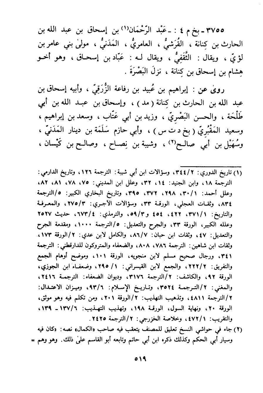 3755 - بخ م 4: - عَبْد الرَّحْمَنِ بن إسحاق بْن عَبد الله بْن الحارث بن كنانة (1) ، القرشي، العامري، المدني، مولى بني عامر بْن لؤي، ويُقال: الثَّقَفِيّ، ويُقال لَهُ: عباد بْن إِسْحَاق، وهُوَ أخو هِشَام بْن إِسْحَاق بْن كنانه، نزل البصرة.