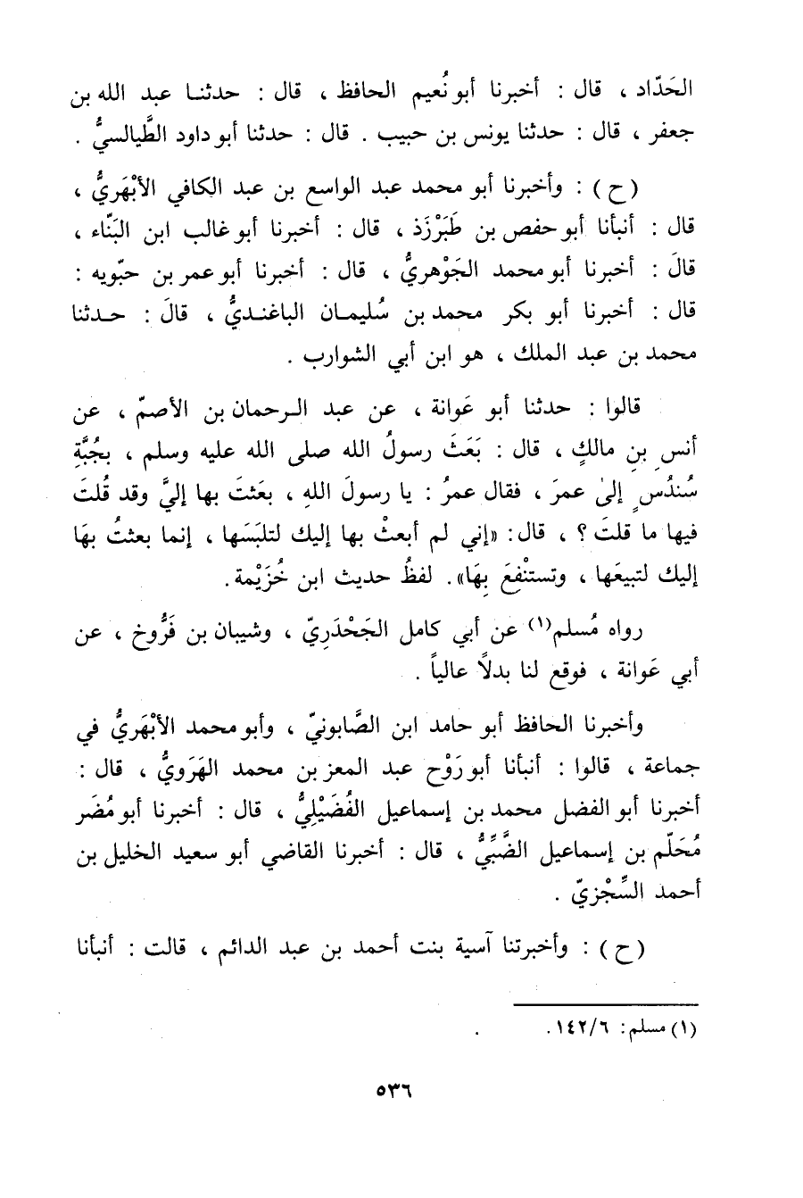 رَوَاهُ مُسْلِمٌ (1) عَن أَبِي كَامِلٍ الْجَحْدَرِيِّ، وشَيْبَانَ بْنِ فَرُّوخَ، عَن أَبِي عَوَانَةَ، فَوَقَعَ لَنَا بَدَلا عَالِيًا.