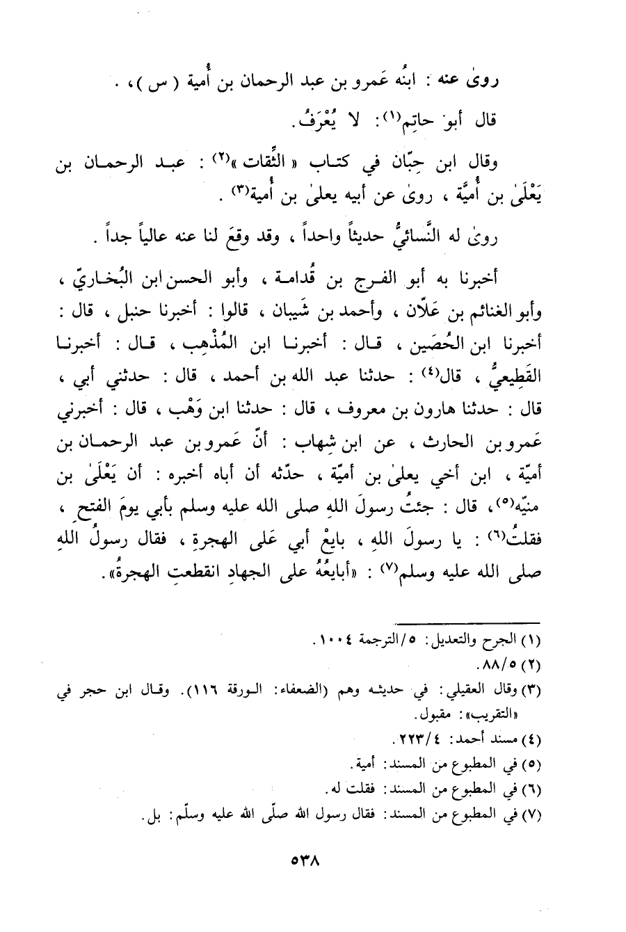 أَخْبَرَنَا بِهِ أَبُو الْفَرَجِ بْنُ قُدَامَةَ، وأبو الحسن بْن البخاري، وأبو الغنائم بْن علان، وأحمد بْن شيبان، قَالُوا: أخبرنا حنبل، قال: أخبرنا ابن الحصين، قال: أخبرنا ابْنُ الْمُذْهِب، قال: أخبرنا القَطِيعِيّ، قال (4) : حَدَّثَنَا عَبد اللَّهِ بْن أَحْمَدَ، قال: حَدَّثني أبي، قال: حَدَّثَنَا هارون بْن معروف، قال: حَدَّثَنَا ابن وهب، قال: أخبرني عَمْرو بْنُ الْحَارِثِ، عَنِ ابْنِ شِهَابٍ: أَنَّ عَمْرو بْنَ عَبْدِ الرَّحْمَنِ بْنِ أُمَيَّةَ، ابْنِ أَخِي يَعْلَى بْنِ أُمَيَّةَ، حَدَّثَهُ أَنَّ أَبَاهُ أَخْبَرَهُ: أَنَّ يَعْلَى بْنَ مُنْيَةَ (5) ، قال: جِئْتُ رَسُولَ اللَّهِ صلى الله عليه وسلم بِأَبِي يَوْمَ الْفَتْحِ، فَقُلْتُ (6) : يَا رَسُولَ اللَّهِ، بَايِعْ أَبِي عَلَى الْهِجْرَةِ، فَقَالَ رَسُولُ اللَّهِ صلى الله عليه وسلم (7) : أُبَايِعُهُ عَلَى الْجِهَادِ انقطعت الهجرة.