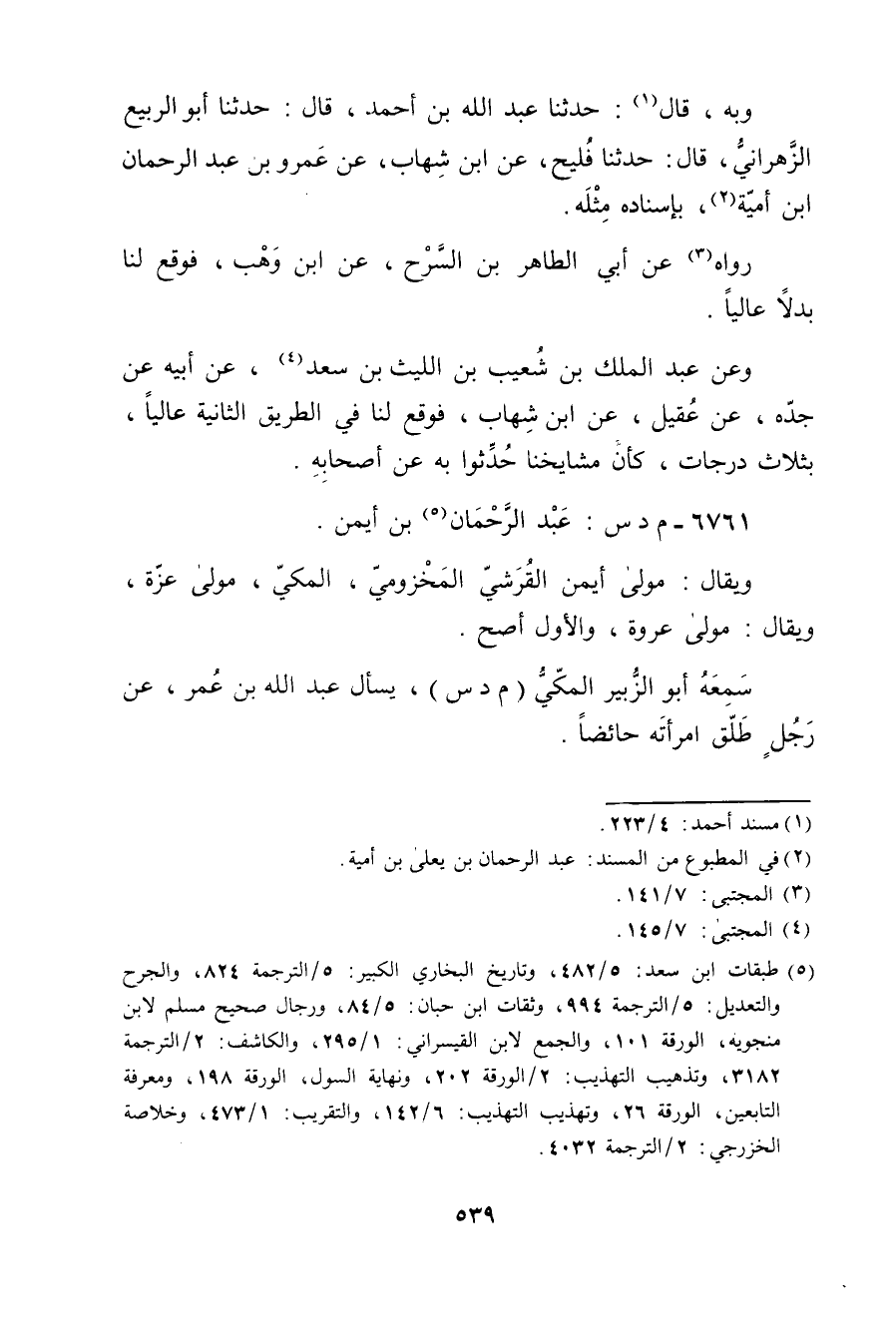 وبه، قال (1) : حَدَّثَنَا عَبد اللَّهِ بْنُ أَحْمَدَ، قال: حَدَّثَنَا أَبُو الربيع الزهراني، قال: حَدَّثَنَا فليح، عَنِ ابْن شهاب، عَنْ عَمْرو بن عبد الرحمن ابن أمية (2) ، بإسناده مثله.
