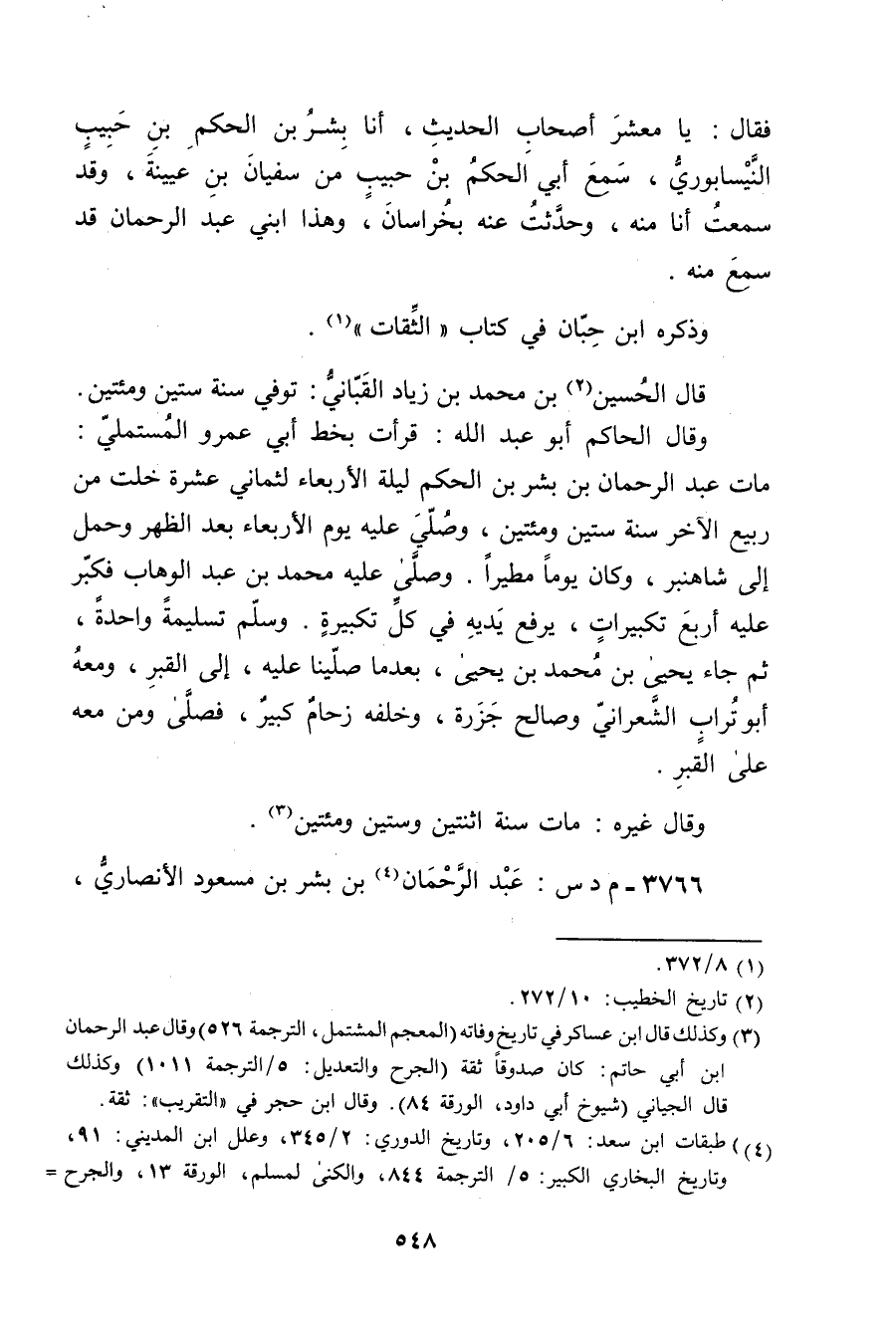وَقَال الحاكم أَبُو عَبْد اللَّهِ: قرأت بخط أَبِي عَمْرو المستملي: مات عَبْد الرَّحْمَنِ بْن بشر بْن الحكم ليلة الأربعاء لثماني عشرة خلت من ربيع الآخر سنة ستين ومئتين، وصلي عليه يوم الأربعاء بعد الظهر وحمل إِلَى شاهنبر، وكَانَ يوما مطيرا. وصلي عليه مُحَمَّد بْن عبد الوهاب فكبر عليه أربع تكبيرات، يرفع يديه فِي كل تكبيرة. وسلم تسليمة واحدة، ثُمَّ جاء يَحْيَى بْن مُحَمَّد بْن يَحْيَى، بعدما صلينا عليه، إِلَى القبر، ومعه أَبُو تراب الشعراني وصالح جزرة، وخلفه زحام كبير، فصلي ومن معه عَلَى القبر.