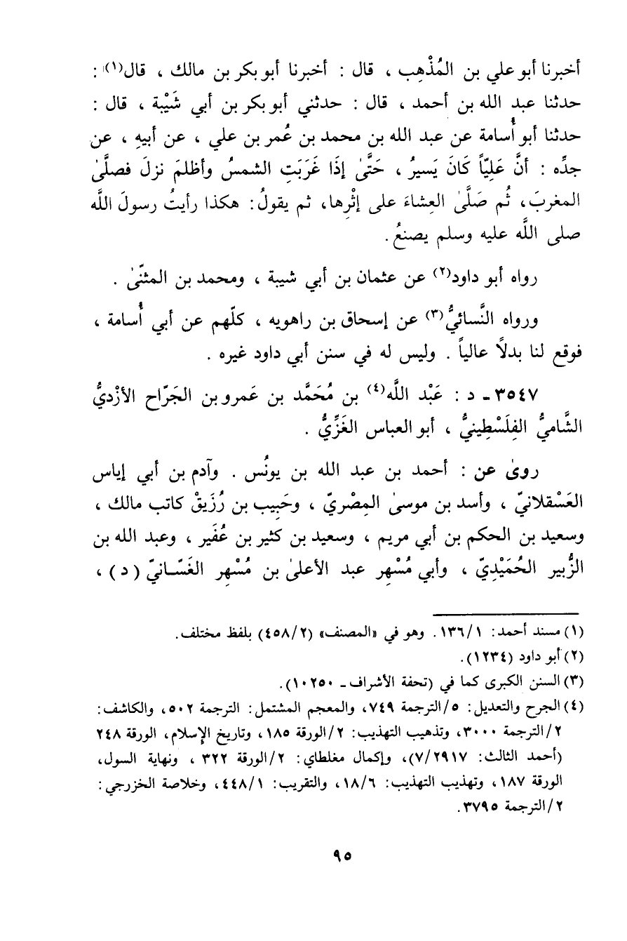 (4) الجرح والتعديل: 5 / الترجمة 749، والمعجم المشتمل: الترجمة 502، والكاشف: 2 / الترجمة 3000، وتذهيب التهذيب: 2 / الورقة 185، وتاريخ الاسلام، الورقة 248 (أحمد الثالث: 2917 / 7) ، وإكمال مغلطاي: 2 / الورقة 322، ونهاية السول، الورقة 187، وتهذيب التهذيب: 6 / 18، والتقريب: 1 / 448، وخلاصة الخزرجي: 2 / الترجمة 3795.