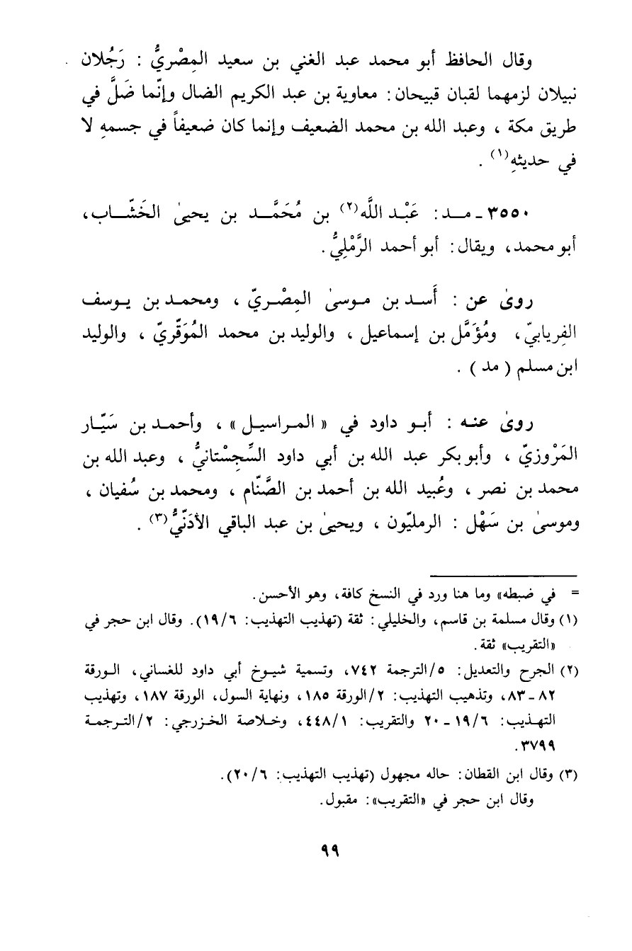 (2) الجرح والتعديل: 5 / الترجمة 742، وتسمية شيوخ أبي داود للغساني، الورقة 82 - 83، وتذهيب التهذيب: 2 / الورقة 185، ونهاية السول، الورقة 187، وتهذيب التهذيب: 6 / 19 - 20 والتقريب: 1 / 448، وخلاصة الخزرجي: 2 / الترجمة 3799.